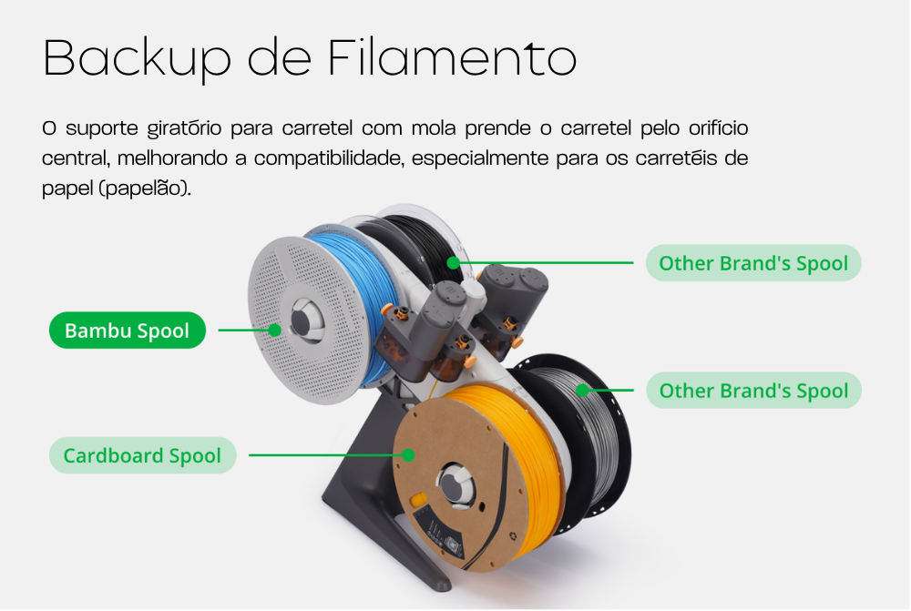 Outro destaque é a compatibilidade com diferentes tipos de carretéis, graças ao sistema de suporte giratório com mola, que proporciona alimentação mais estável e maior flexibilidade no uso de diferentes marcas e materiais.