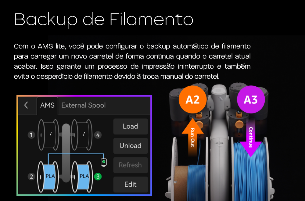 Além disso, o sistema conta com backup automático de filamento, garantindo que a impressão continue mesmo quando um rolo se esgota. Isso reduz falhas, evita desperdício de material e aumenta a segurança em impressões longas ou produções contínuas.