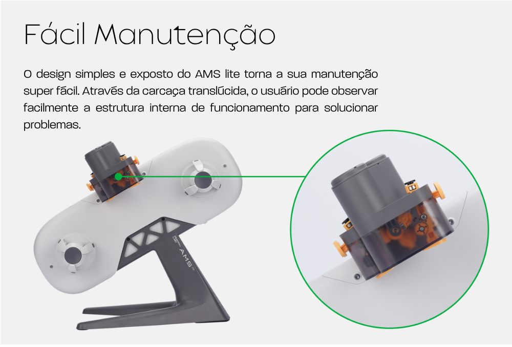 Projetado para integração total com o ecossistema Bambu Lab, o AMS Lite trabalha de forma sincronizada com o Bambu Studio, facilitando o gerenciamento dos filamentos e o controle do processo de impressão. Sua estrutura compacta e modular permite instalação rápida e organização do ambiente de trabalho, sem comprometer o espaço.