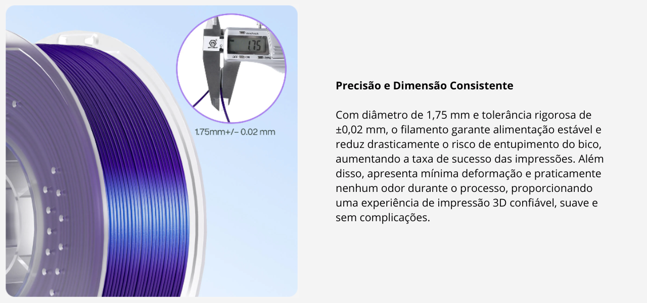 O filamento PLA Galaxy 1,75 mm oferece tolerância rigorosa de ±0,02 mm, garantindo alimentação estável e reduzindo drasticamente o risco de entupimentos. Essa precisão assegura maior taxa de sucesso nas impressões 3D, com mínima deformação e sem odores indesejados. Resultado: uma experiência de impressão suave, confiável e sem complicações, ideal para peças detalhadas e funcionais.