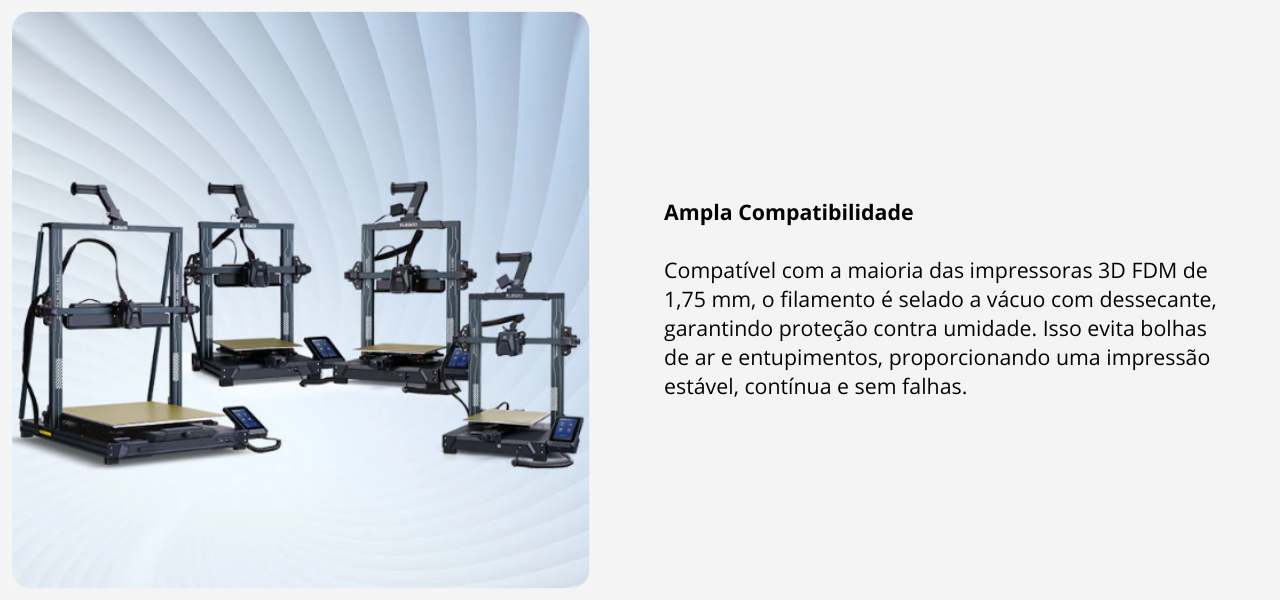 O filamento PLA Galaxy é compatível com a maioria das impressoras 3D FDM de 1,75 mm disponíveis no mercado, garantindo versatilidade em diferentes equipamentos. Cada rolo é selado a vácuo com dessecante, oferecendo proteção eficaz contra umidade e evitando a formação de bolhas de ar ou entupimentos no bico.