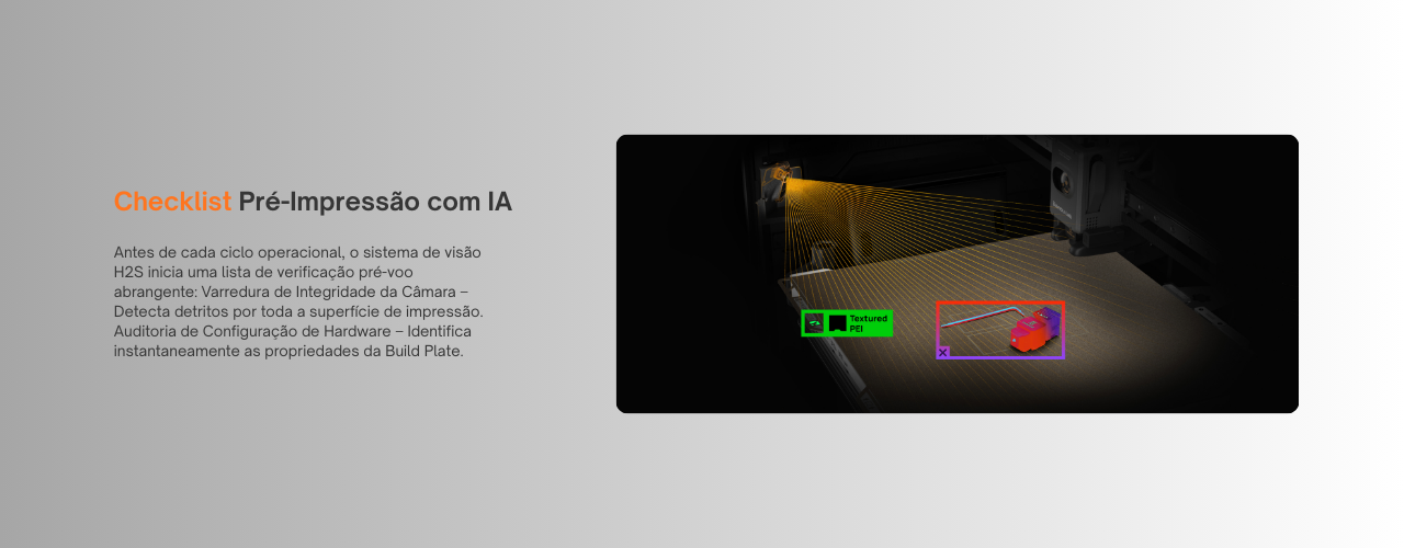 Antes de iniciar cada trabalho, a Bambu Lab H2S executa um checklist de pré-impressão com inteligência artificial, garantindo que tudo esteja pronto para uma impressão bem-sucedida. O sistema de visão analisa automaticamente a superfície da mesa, identifica possíveis irregularidades e verifica a integridade da build plate.