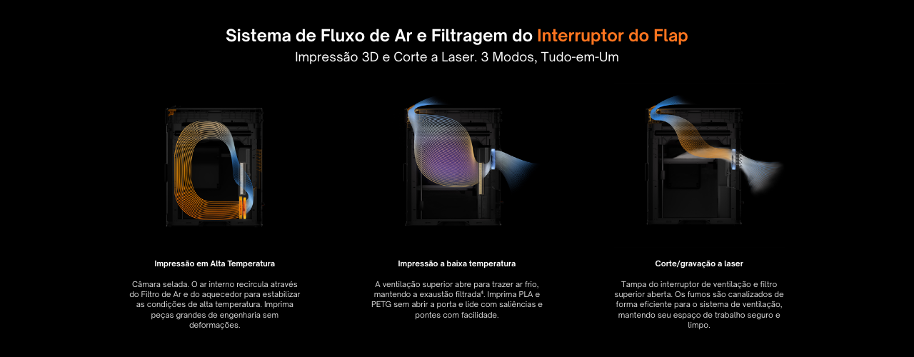 No modo de impressão em alta temperatura, a câmara selada recircula o ar aquecido e mantém estabilidade térmica para peças de engenharia, reduzindo deformações. Em impressões de baixa temperatura, a ventilação superior se abre para melhorar a exaustão e facilitar o uso de materiais como PLA e PETG. Já no modo de corte ou gravação a laser, o sistema direciona os fumos para a filtragem, mantendo o ambiente de trabalho mais limpo e seguro.