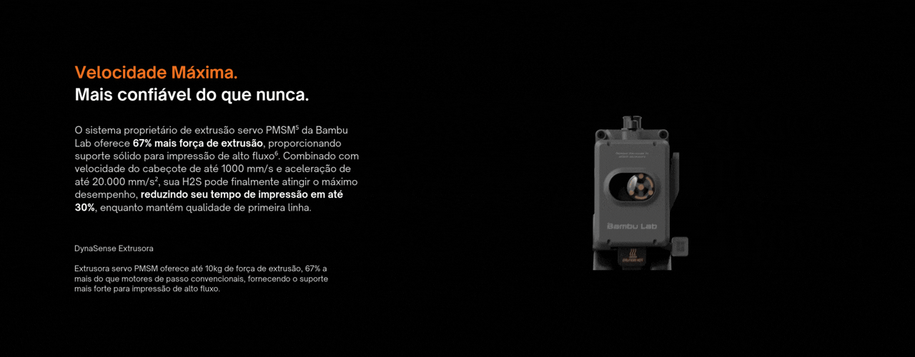 Projetada para impressões rápidas e estáveis, a H2S combina um sistema avançado de extrusão servo com movimentos de alta velocidade e aceleração precisa. Esse conjunto garante fluxo consistente mesmo em impressões de alto desempenho, evitando falhas comuns em velocidades elevadas.