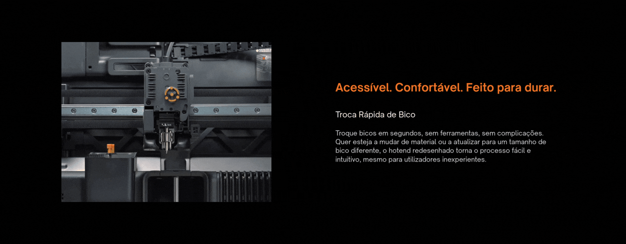 Isso facilita tanto a mudança de materiais quanto a adaptação para diferentes diâmetros de bico, tornando o processo intuitivo até para usuários menos experientes. O resultado é menos tempo parado, mais praticidade no uso diário e um equipamento feito para acompanhar sua produção por muito mais tempo.