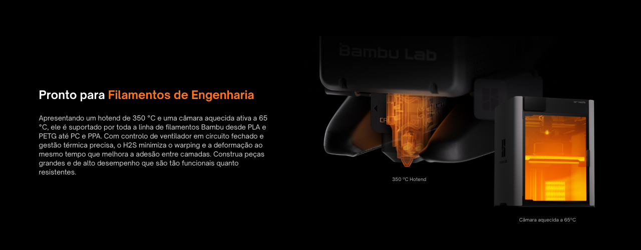 Projetada para trabalhar com filamentos de engenharia com total estabilidade, a H2S conta com hotend de até 350 °C e câmara aquecida ativa a 65 °C, oferecendo controle térmico preciso para materiais que exigem altas temperaturas e condições estáveis de impressão.