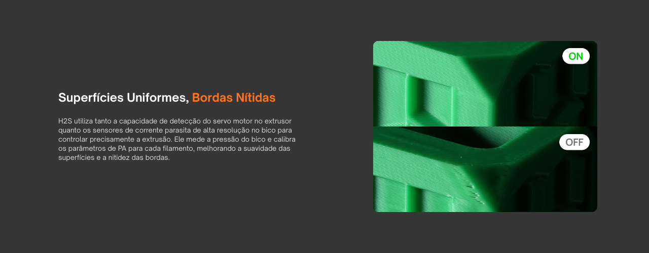 A Bambu Lab H2S entrega superfícies mais uniformes e bordas nítidas graças ao controle inteligente de extrusão. O sistema combina a detecção do servo motor no extrusor com sensores de alta resolução no bico, ajustando o fluxo de material em tempo real.