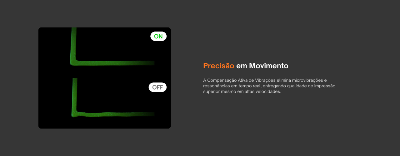 A Compensação Ativa de Vibrações elimina microvibrações e ressonâncias durante o movimento, ajustando o comportamento da impressora em tempo real e garantindo trajetórias mais estáveis e precisas.