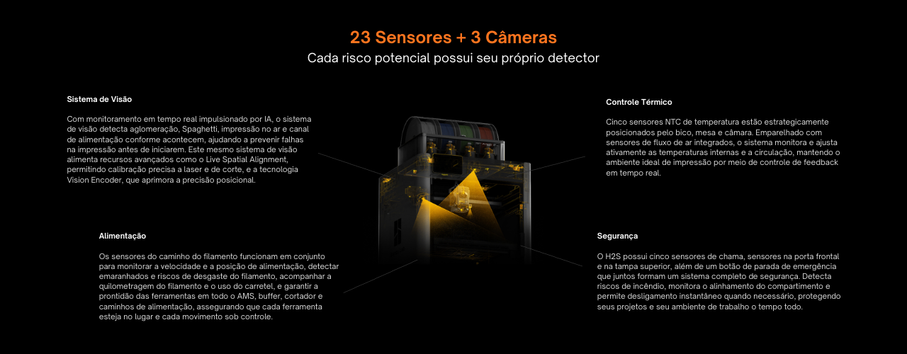 Um sistema avançado com 23 sensores e 3 câmeras monitora cada etapa da impressão em tempo real. Cada risco potencial é acompanhado por detectores específicos, garantindo controle contínuo e preciso do processo.