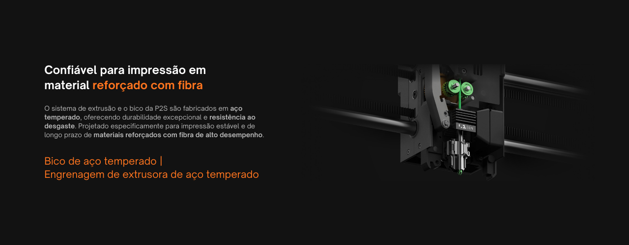 A Bambu Lab P2S foi projetada para lidar com materiais reforçados com fibra com total confiabilidade. O bico de aço temperado e a engrenagem da extrusora também em aço temperado garantem alta resistência ao desgaste, mesmo em impressões longas e exigentes.