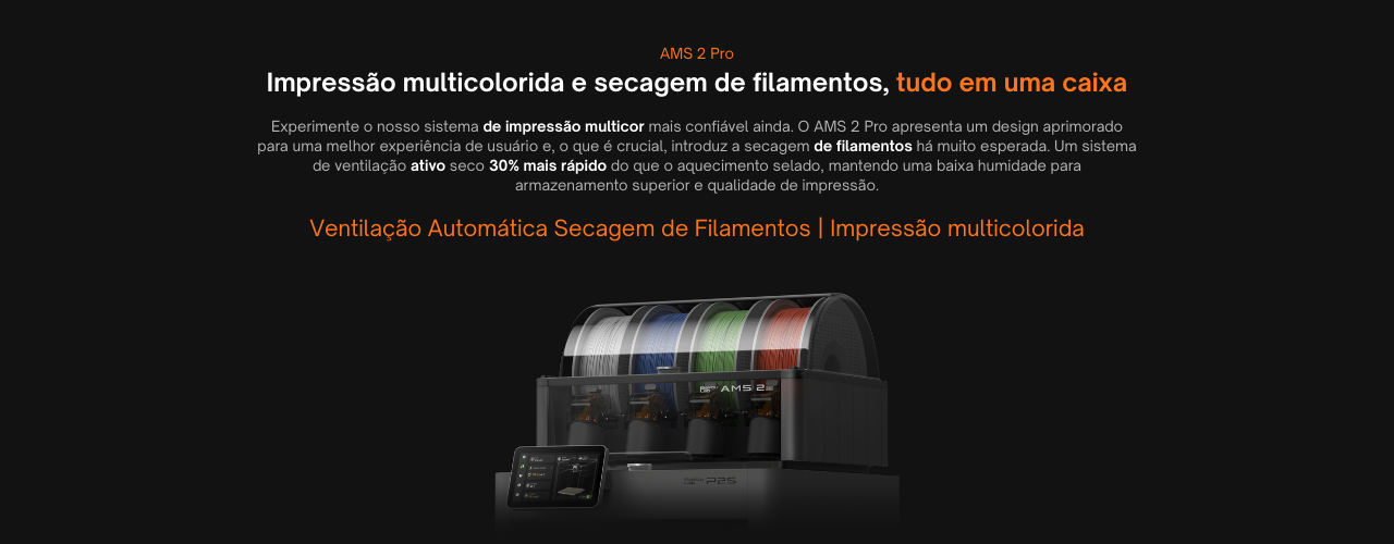 | Secagem de filamento | Via AMS 2 Pro (somente versão Combo) |