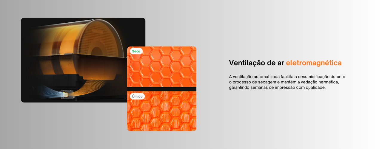 Com isso, o material permanece seco por mais tempo, evitando falhas de extrusão e assegurando semanas de impressão com qualidade consistente, mesmo em ambientes com maior umidade. Mais confiabilidade para quem imprime com frequência e exige resultados previsíveis.