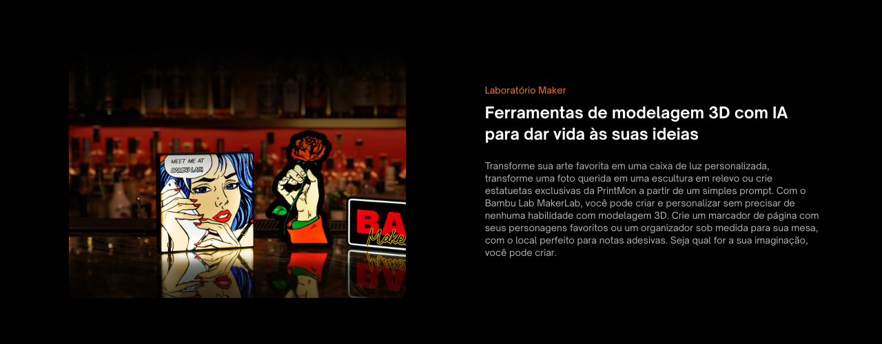 Crie caixas de luz personalizadas, esculturas em relevo, estatuetas exclusivas a partir de simples prompts ou organizadores sob medida para o seu dia a dia. Seja para projetos decorativos, funcionais ou criativos, o MakerLab coloca a criação ao alcance de qualquer pessoa. Você imagina, a P2S imprime.