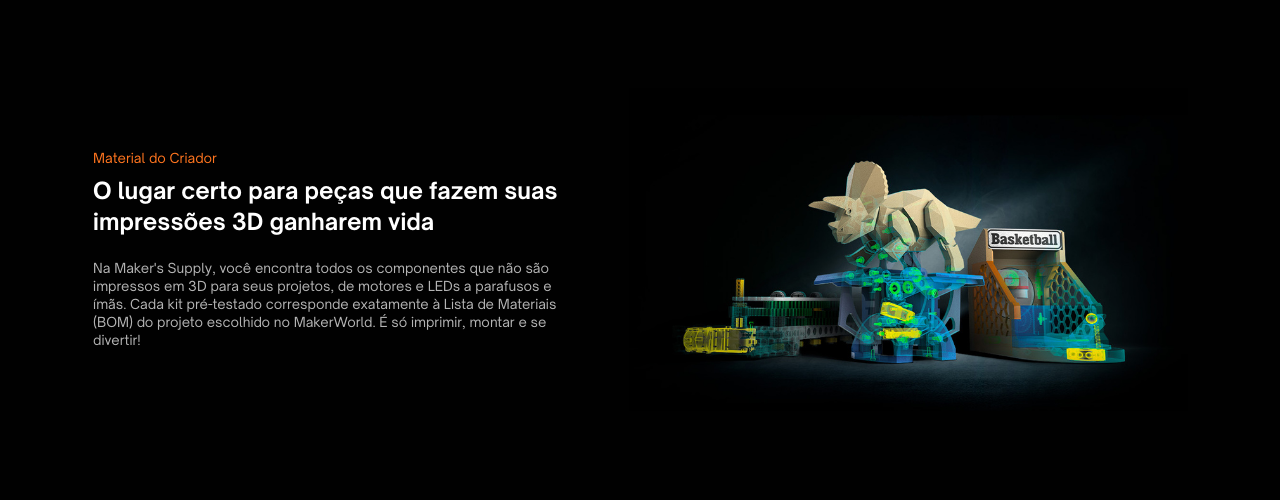 Cada kit é pré-testado e corresponde exatamente à lista de materiais (BOM) dos projetos disponíveis no MakerWorld. Assim, você só precisa imprimir as peças, montar e aproveitar o resultado final. Mais praticidade, menos improviso e muito mais diversão ao criar.