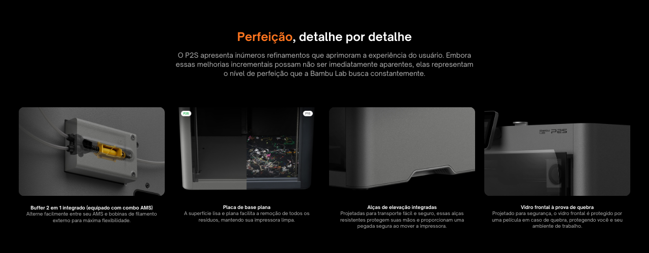 Cada refinamento da Bambu Lab P2S foi pensado para tornar sua experiência mais simples, segura e precisa. Da base plana que facilita a remoção das peças, passando pelas alças integradas para transporte seguro, até o vidro frontal resistente a impactos, tudo foi cuidadosamente projetado para elevar o padrão da impressão 3D no dia a dia.
