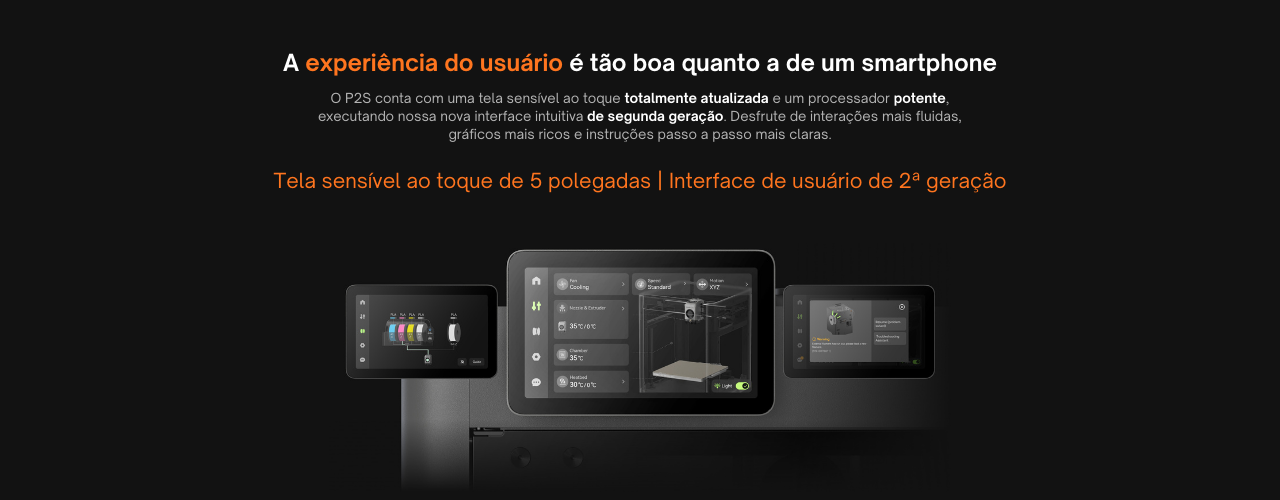 A Bambu Lab P2S oferece uma experiência de uso moderna e fluida, graças à tela sensível ao toque de 5 polegadas e à interface de usuário de 2ª geração. Tudo foi pensado para tornar a operação simples, rápida e intuitiva, mesmo para quem está começando.