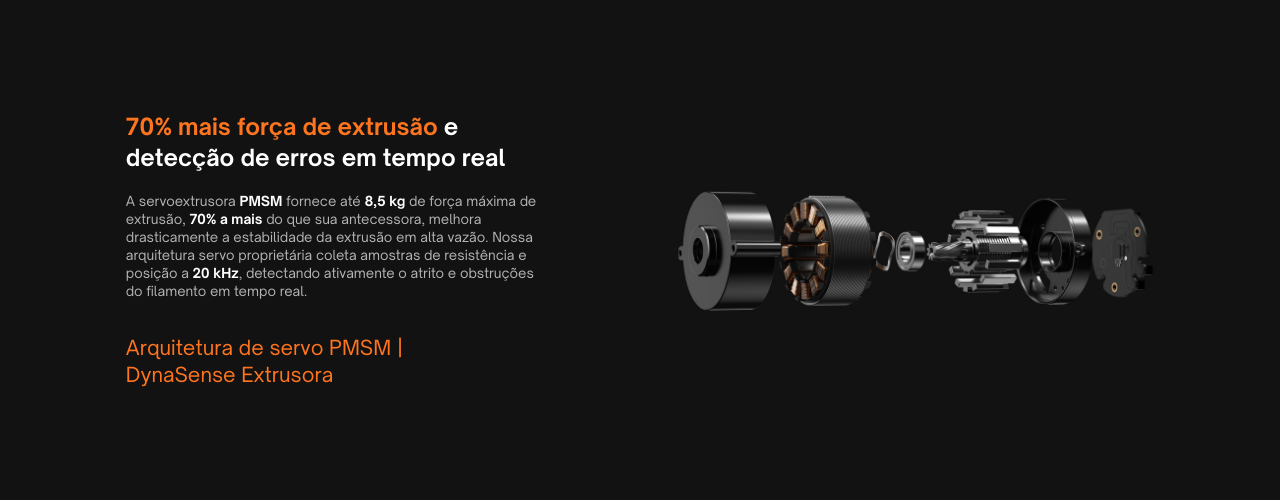 A Bambu Lab P2S eleva o desempenho com 70% mais força de extrusão, garantindo alimentação de filamento estável mesmo em altas vazões. A servoextrusora com arquitetura PMSM entrega até 8,5 kg de força, proporcionando impressões mais consistentes e confiáveis.