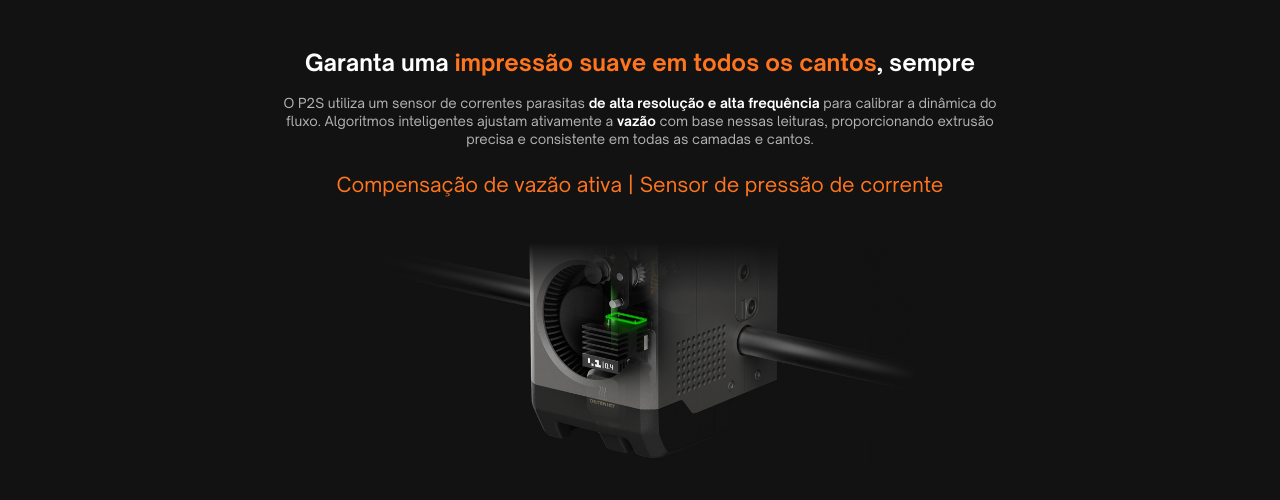 A Bambu Lab P2S garante extrusão precisa e consistente graças ao sensor de pressão de corrente de alta resolução e alta frequência. Esse sistema calibra dinamicamente o fluxo do filamento, ajustando a vazão em tempo real para cada movimento da impressora.