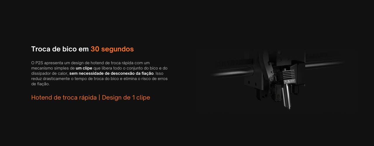 A Bambu Lab P2S traz um hotend de troca rápida que permite substituir o bico em apenas 30 segundos. O design inteligente com sistema de 1 clipe libera todo o conjunto do bico e do dissipador de calor de forma prática, sem necessidade de desconectar a fiação.