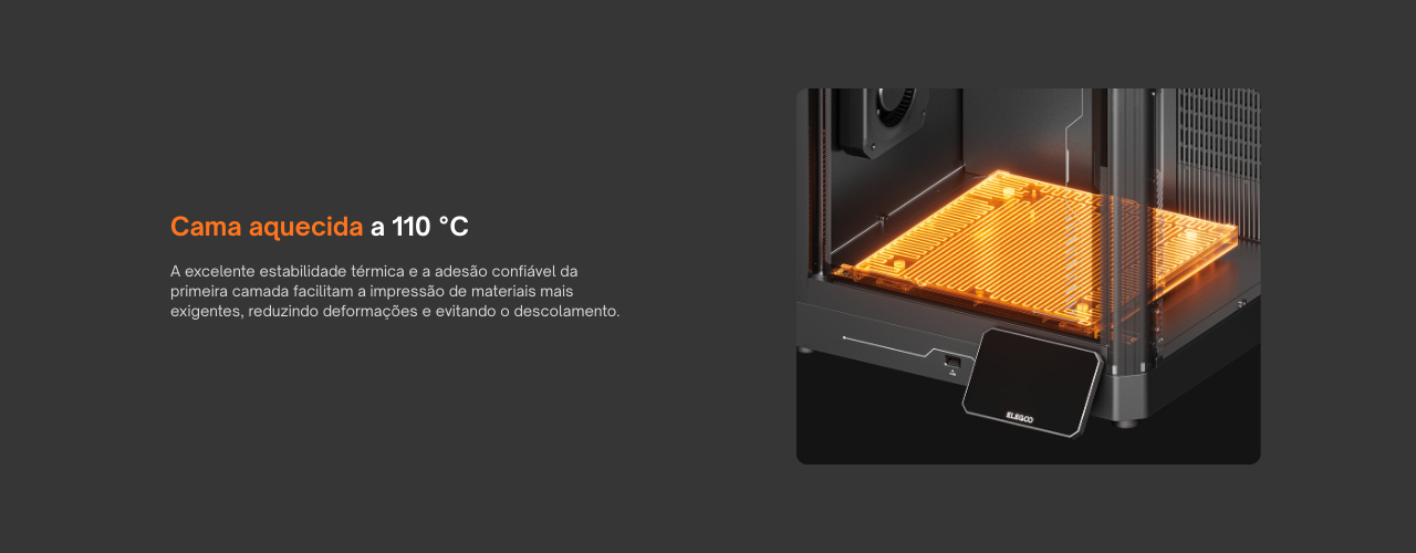 A cama aquecida de até 110 °C garante excelente aderência da primeira camada e maior estabilidade térmica durante toda a impressão. Esse controle preciso facilita o uso de materiais mais exigentes, reduzindo deformações, empenamentos e riscos de descolamento.