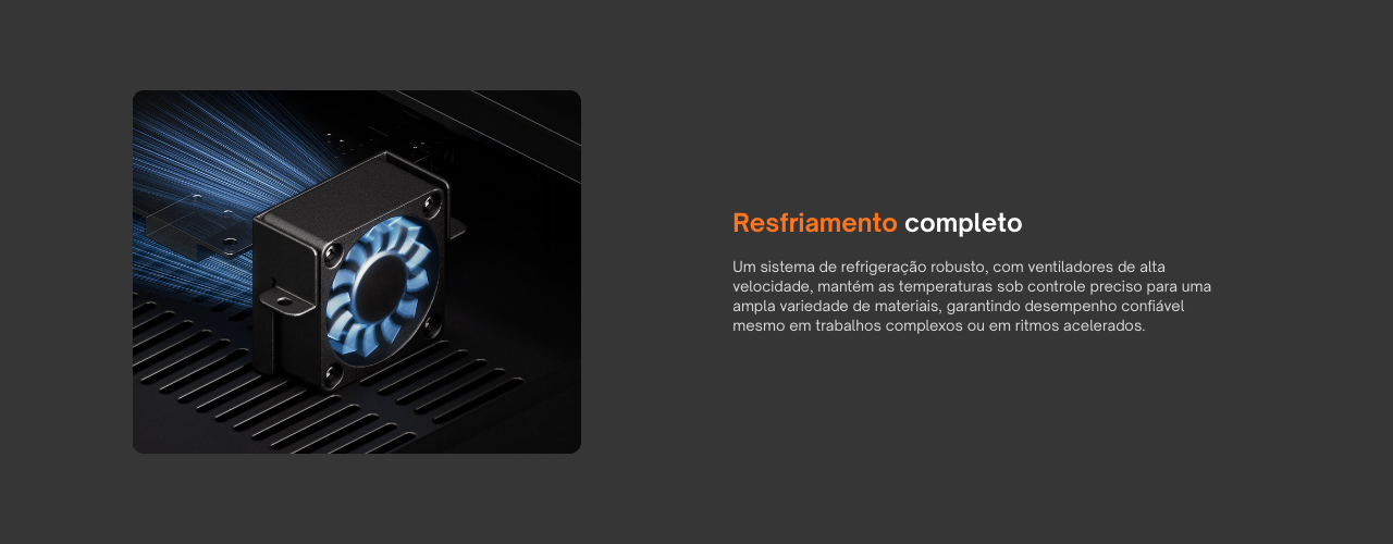 O sistema de resfriamento completo garante controle preciso das temperaturas durante toda a impressão. Com ventiladores de alta eficiência, o fluxo de ar é distribuído de forma equilibrada, mantendo a estabilidade térmica mesmo em materiais diferentes ou impressões em alta velocidade.