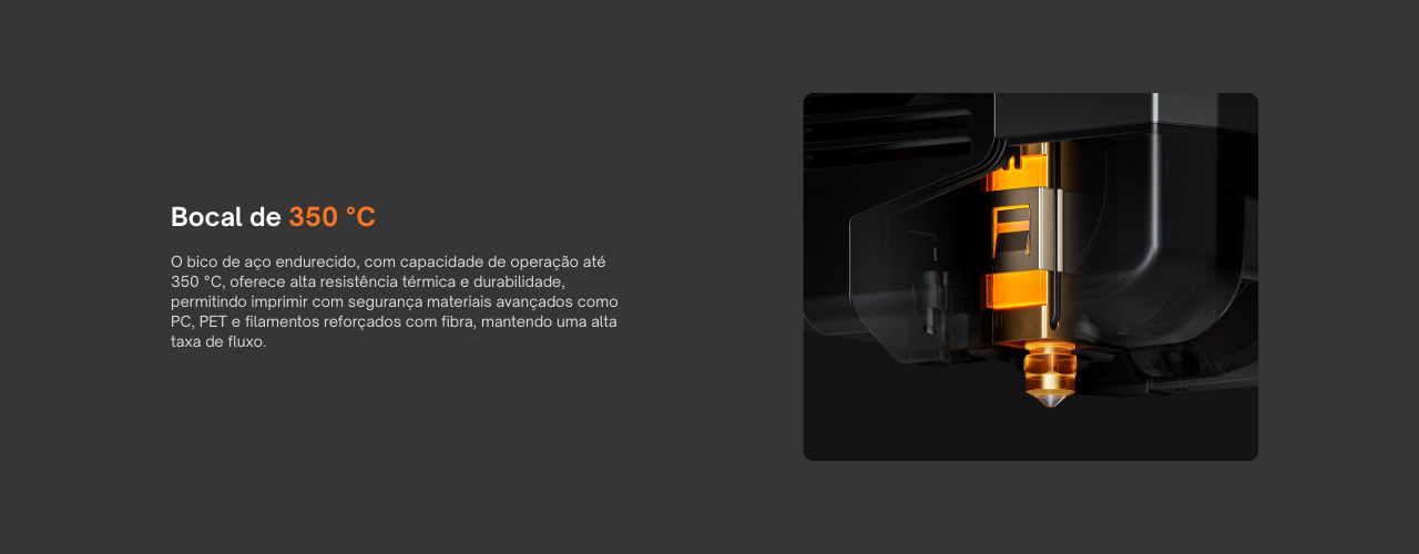O bocal de até 350 °C, fabricado em aço endurecido, oferece alta resistência térmica e durabilidade para impressões mais exigentes. Essa capacidade permite trabalhar com materiais técnicos e filamentos reforçados com fibra, mantendo estabilidade e fluxo consistente.