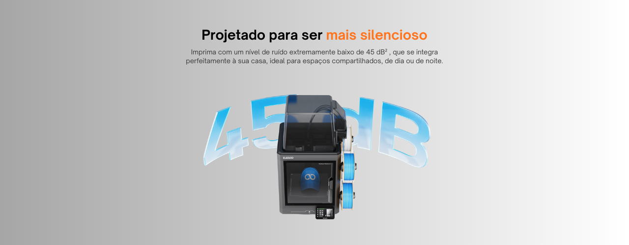 Projetada para operar com níveis de ruído extremamente baixos, a Elegoo Centauri Carbon 2 Combo oferece uma experiência de impressão muito mais confortável. Com emissão sonora em torno de 45 dB, a impressora se integra facilmente a ambientes domésticos, educacionais ou espaços compartilhados.
