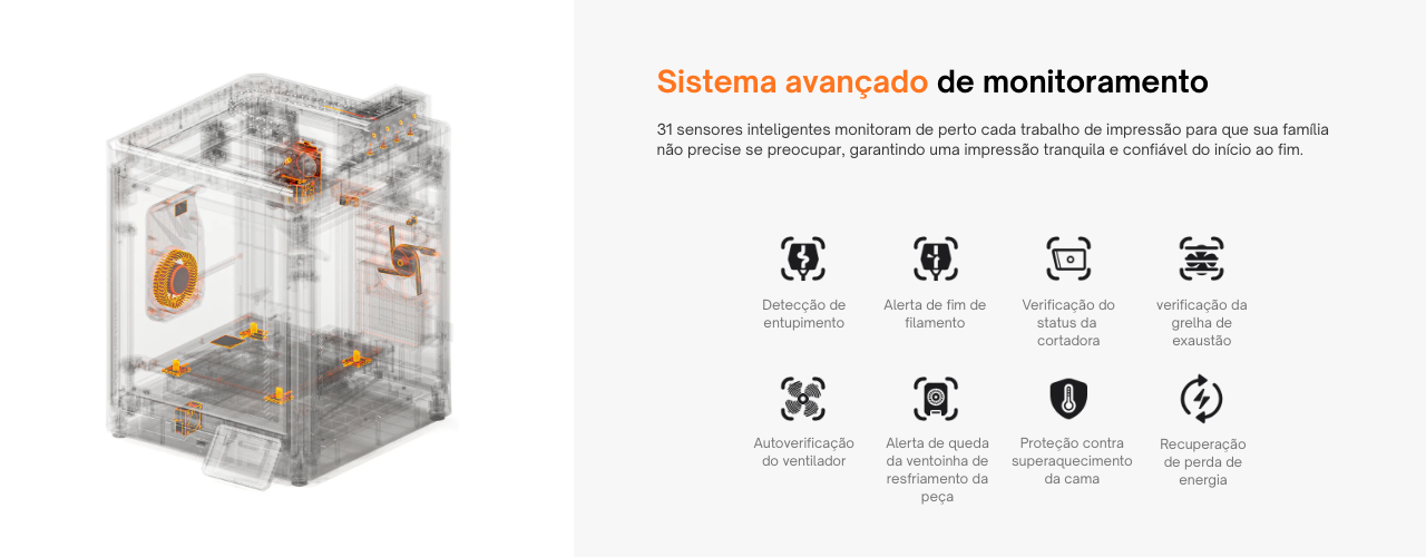 Na prática, o sistema aumenta a segurança operacional, reduz falhas inesperadas e garante uma impressão mais tranquila do início ao fim. Ideal para impressões longas, uso doméstico ou projetos onde confiabilidade e proteção do equipamento são essenciais.