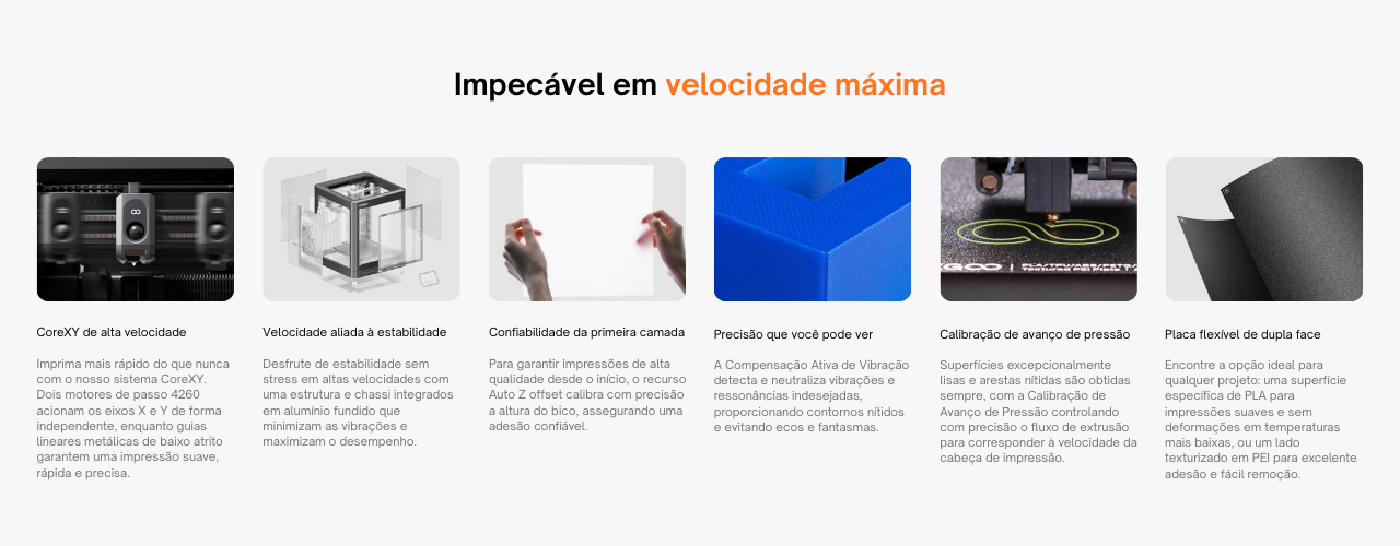 | Sistema de movimento | CoreXY com velocidade máxima de 500 mm/s e aceleração até 20.000 mm/s² |