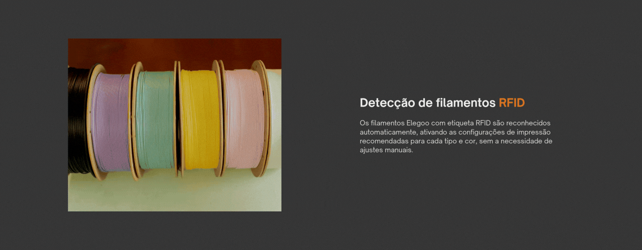 A Elegoo Centauri Carbon 2 Combo conta com detecção de filamentos via RFID, que reconhece automaticamente os filamentos Elegoo compatíveis e aplica as configurações ideais de impressão para cada material e cor.