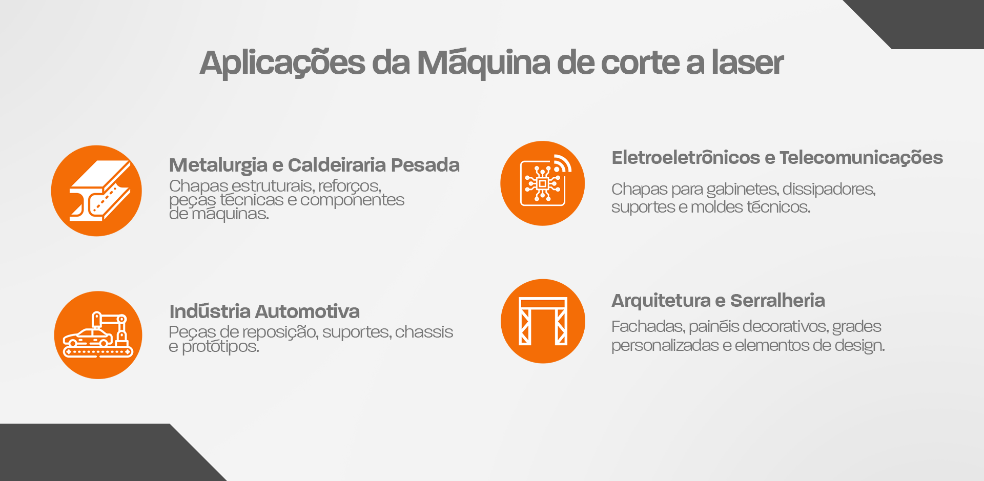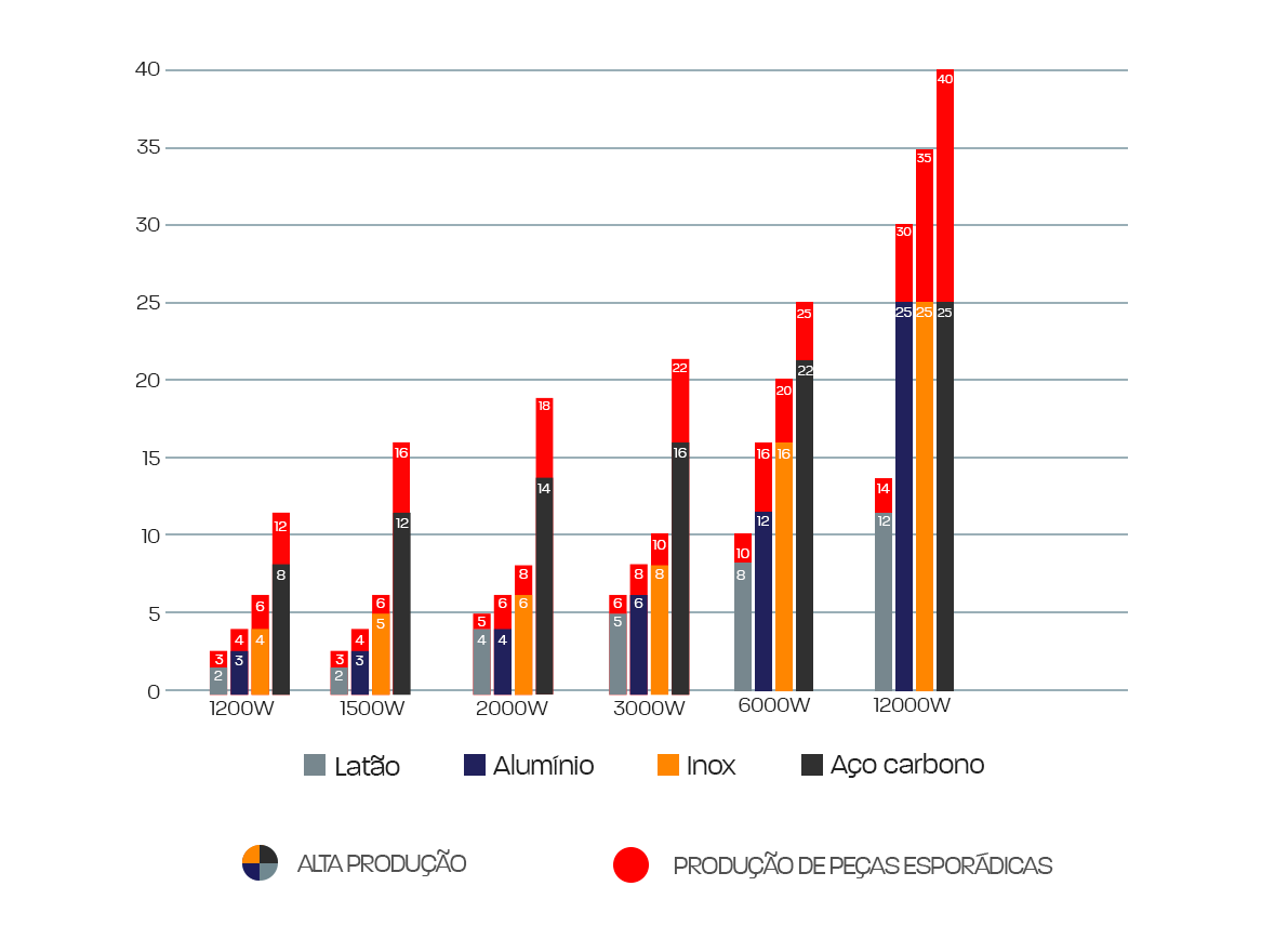 | Área de Corte – Tubos | Diâmetro: 20 – 220 mm (customizável) / Comprimento: até 6 m (customizável) |