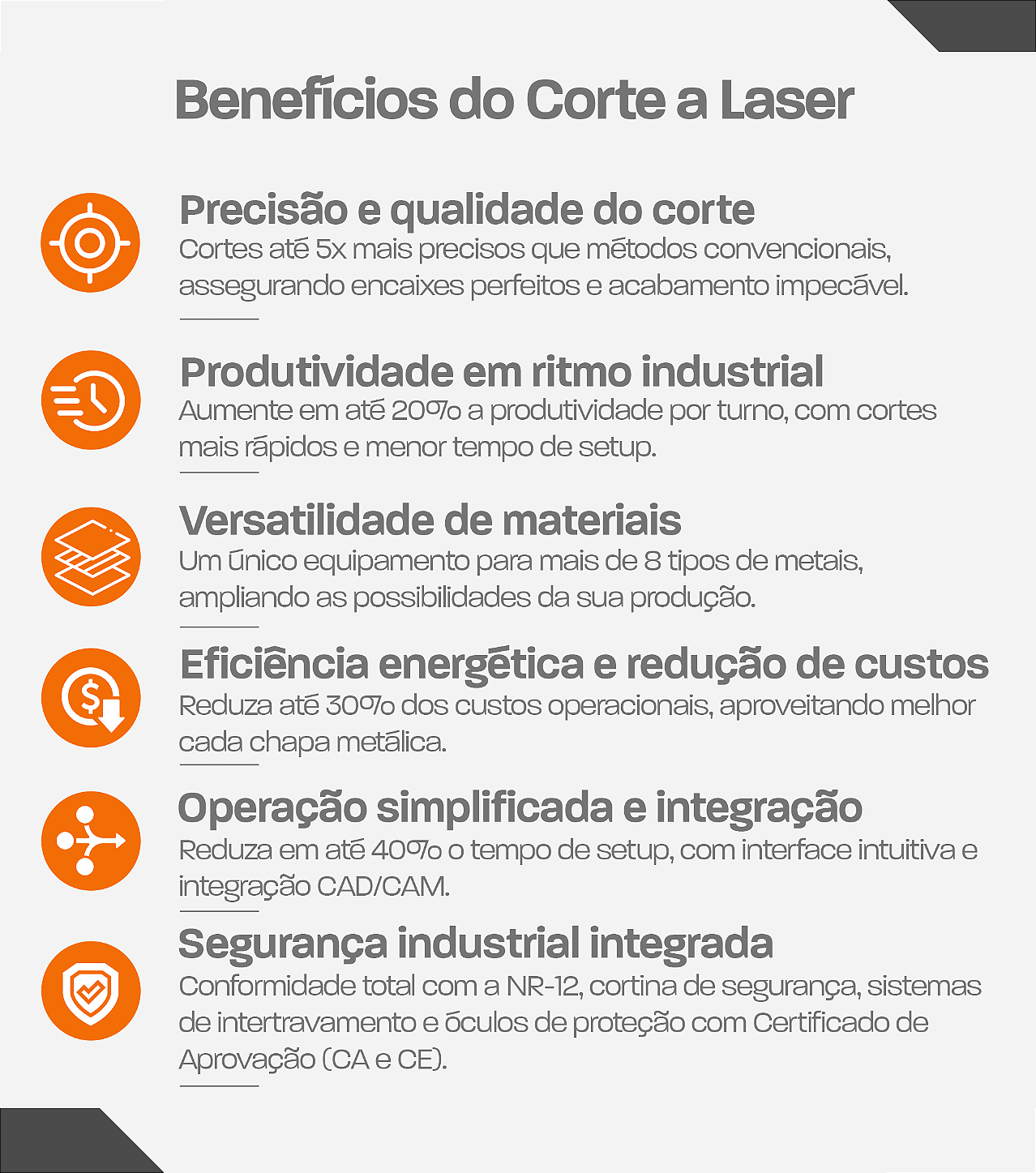 A máquina de corte a laser já sai de fábrica 100% adequada à NR-12, atendendo todas as exigências de segurança para operação industrial.