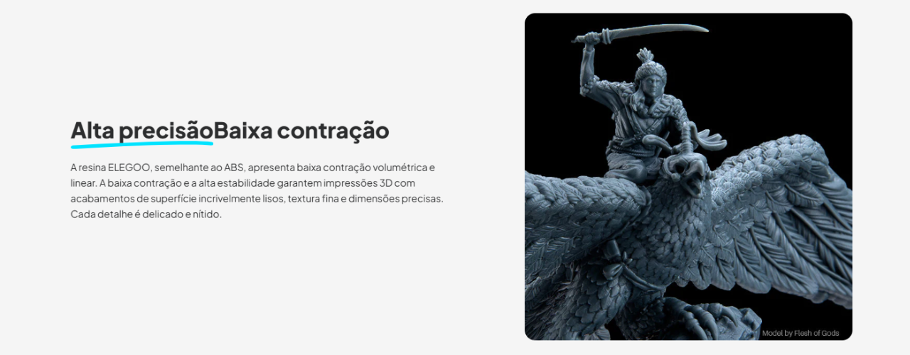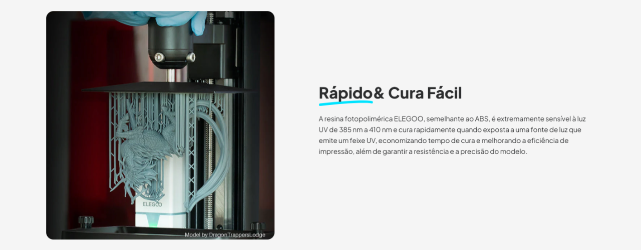 Além da velocidade, a formulação garante excelente definição de detalhes, alta resistência mecânica e precisão dimensional, tornando a resina ideal para miniaturas, protótipos funcionais, peças técnicas e modelos detalhados. O equilíbrio entre rapidez de cura e estabilidade resulta em impressões mais confiáveis, com menos falhas e acabamento consistente do início ao fim.