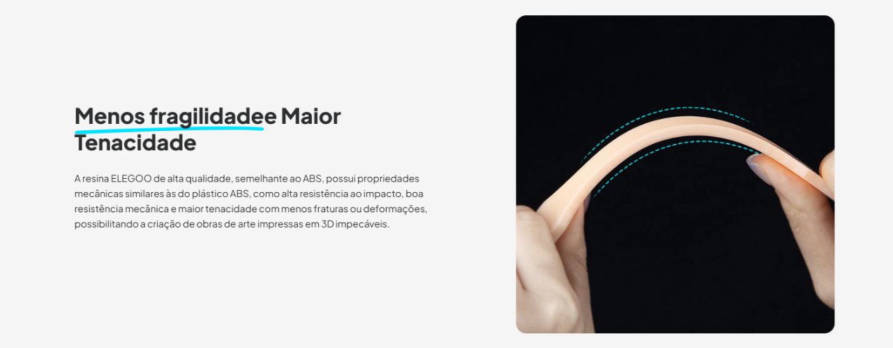 A resina ABS-like V1 da Elegoo oferece um excelente equilíbrio entre resistência mecânica e flexibilidade, reduzindo significativamente a fragilidade comum em resinas padrão. Sua composição proporciona maior tenacidade, resistência ao impacto e menor risco de trincas ou quebras, mesmo em peças mais finas ou detalhadas.