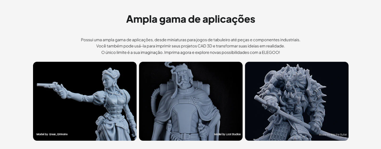 A resina ABS-like V1 da Elegoo é extremamente versátil, atendendo desde miniaturas altamente detalhadas para jogos de tabuleiro, action figures e colecionáveis, até protótipos funcionais, peças técnicas e componentes de uso geral. Sua combinação de precisão, resistência e acabamento a torna adequada para diferentes níveis de exigência.