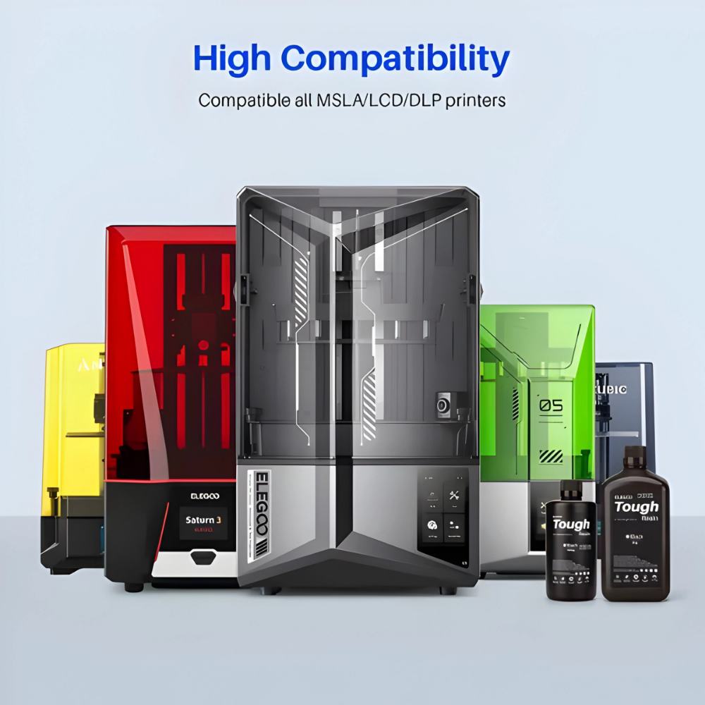 A Resina Elegoo Tough é compatível com impressoras 3D LCD, MSLA e DLP, incluindo as linhas Mars, Saturn e Jupiter da ELEGOO. Para ajuste de parâmetros, a marca mantém uma planilha oficial de configurações no seu centro de downloads.