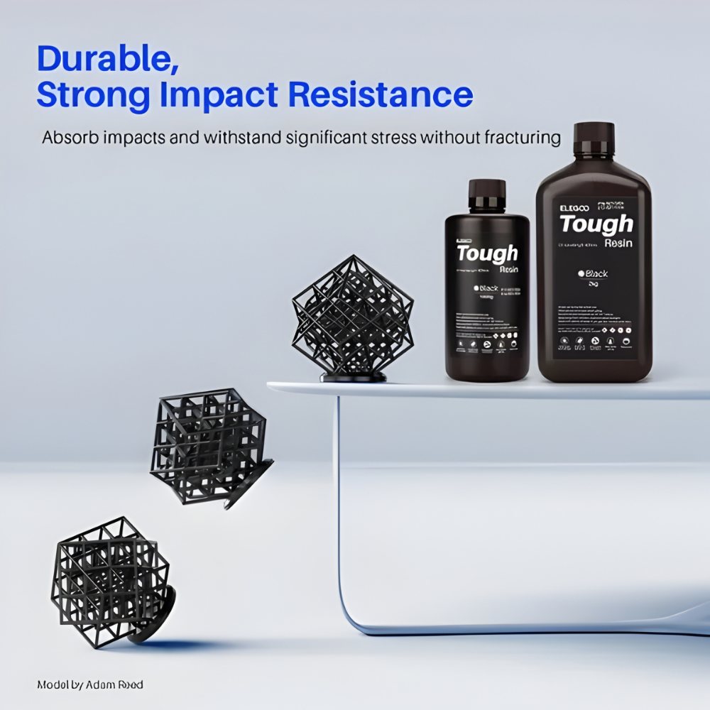 A ELEGOO informa que a Tough Resin foi desenvolvida para suportar cargas e tensões sem deformação, sendo indicada para peças que exigem mais robustez em aplicações de engenharia e uso funcional.