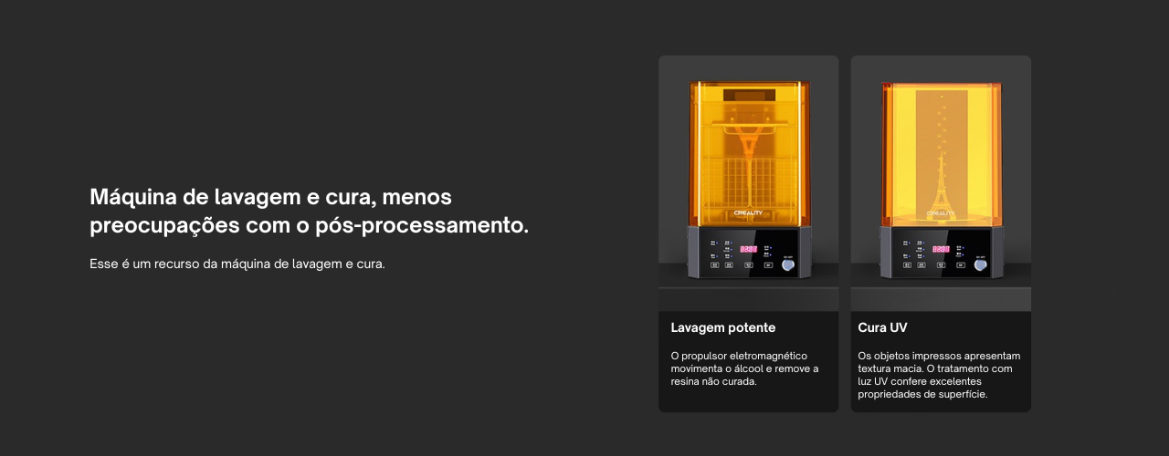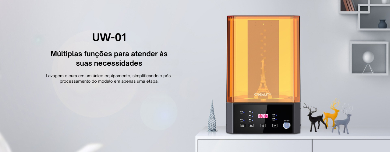 A Creality UW-01 Wash & Cure foi desenvolvida para simplificar o pós-processamento de impressões 3D em resina, reunindo lavagem potente e cura UV em um único equipamento. Essa integração reduz etapas manuais, diminui o contato direto com a resina e torna o fluxo de trabalho mais prático e organizado.