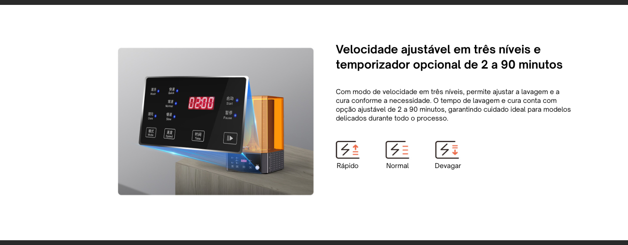 Além disso, o temporizador ajustável de 2 a 90 minutos proporciona controle preciso do tempo de lavagem e cura, evitando excesso de exposição ou limpeza inadequada. Esse ajuste fino assegura um pós-processamento mais seguro, eficiente e consistente, resultando em peças com melhor acabamento e maior durabilidade.