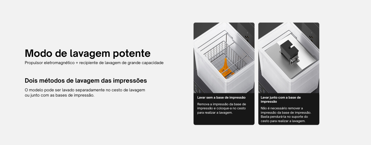 Conta com um modo de lavagem potente, que combina propulsor eletromagnético e um recipiente de lavagem de grande capacidade para remover resíduos de resina com eficiência. Esse sistema garante uma limpeza uniforme, alcançando detalhes e cavidades dos modelos impressos, mesmo em peças mais complexas.