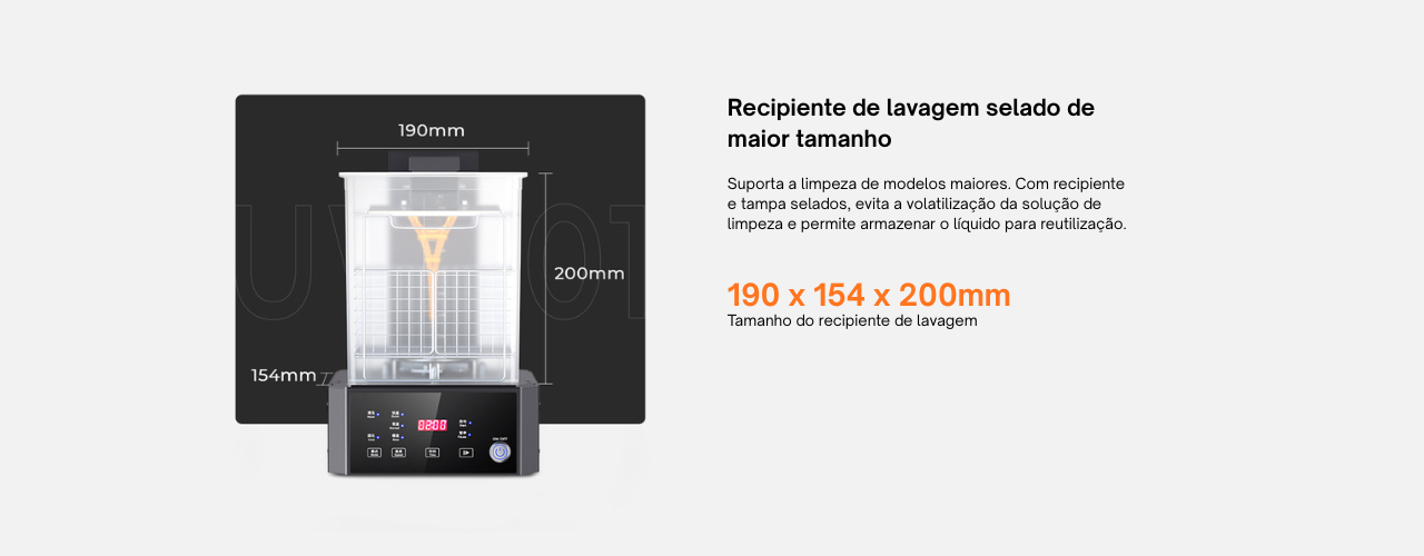 Com dimensões internas de 190 × 154 × 200 mm, o recipiente permite realizar a lavagem de peças volumosas ou múltiplos modelos em uma única sessão. Além disso, o sistema selado facilita o armazenamento e a reutilização do líquido de limpeza, tornando o pós-processamento mais prático, econômico e organizado.