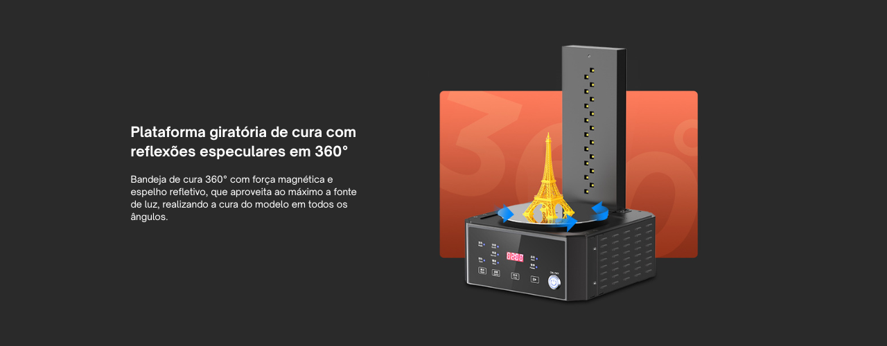 Com a rotação contínua e as reflexões especulares em 360°, a peça recebe luz em todos os ângulos, assegurando uma cura completa e homogênea. O resultado são impressões 3D em resina com melhor acabamento, maior resistência mecânica e maior confiabilidade para uso final ou pintura.