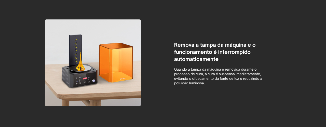 Esse sistema de proteção ajuda a preservar a fonte de luz e reduz a emissão de luz indesejada no ambiente, garantindo um processo de cura mais controlado e confiável. Assim, o usuário pode operar a máquina com mais tranquilidade, mantendo a segurança sem comprometer a eficiência do pós-processamento.