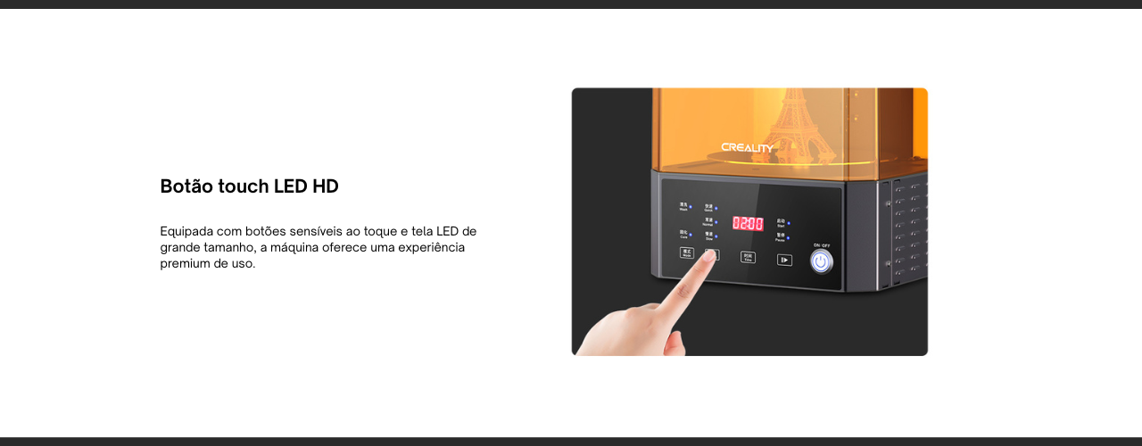 A tela LED de fácil leitura exibe claramente as configurações e o tempo restante do processo, proporcionando mais controle e conforto no uso diário. Essa interface moderna garante uma experiência mais prática e premium, ideal tanto para iniciantes quanto para usuários experientes em impressão 3D em resina.